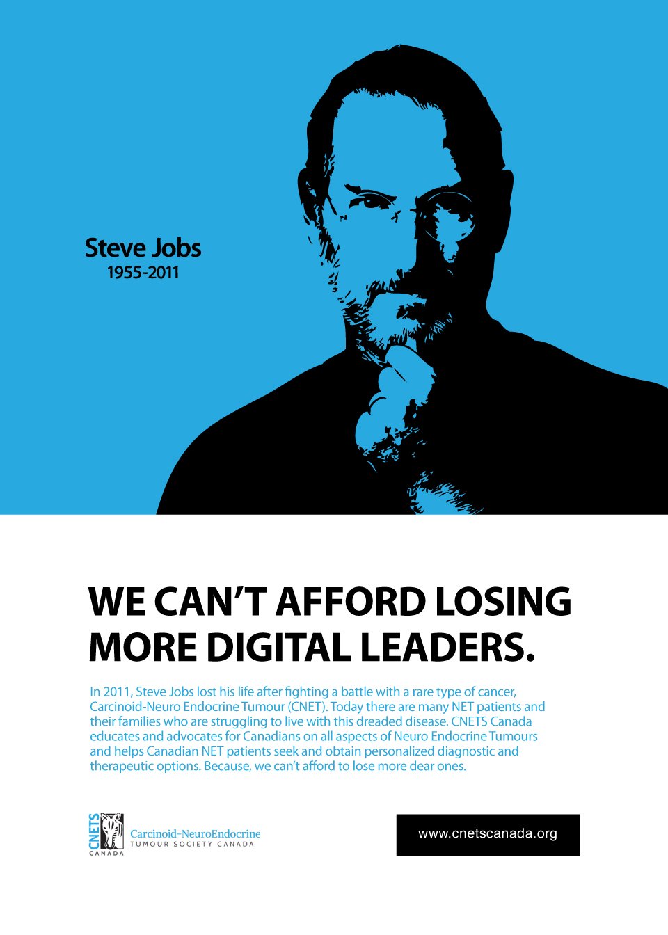 Through extensive online research about this cancer type, a lot of new facts came to my knowledge. One of them was that Steve Jobs had suffered this deadly disease. So, I drew inspiration from this finding and made my first draft. Jobs – the Digital Guru is known by one and all. My idea was to use his popularity to draw people’s attention towards the cause. This way people will be able to relate easily. For this purpose, I illustrated one of his famous posters and crafted the copy around my thought “We can not afford losing more digital leaders”. Here is my first ad for CNETS.