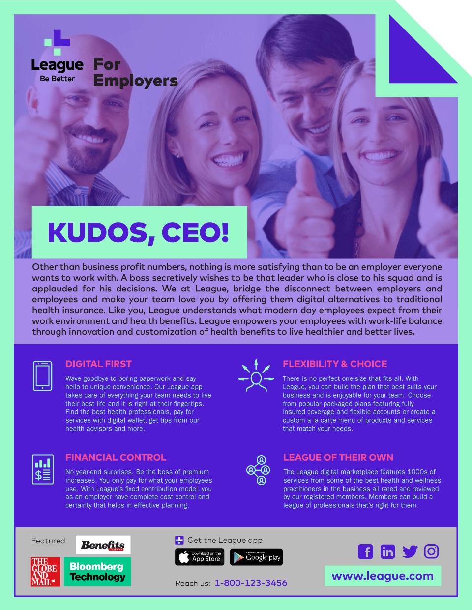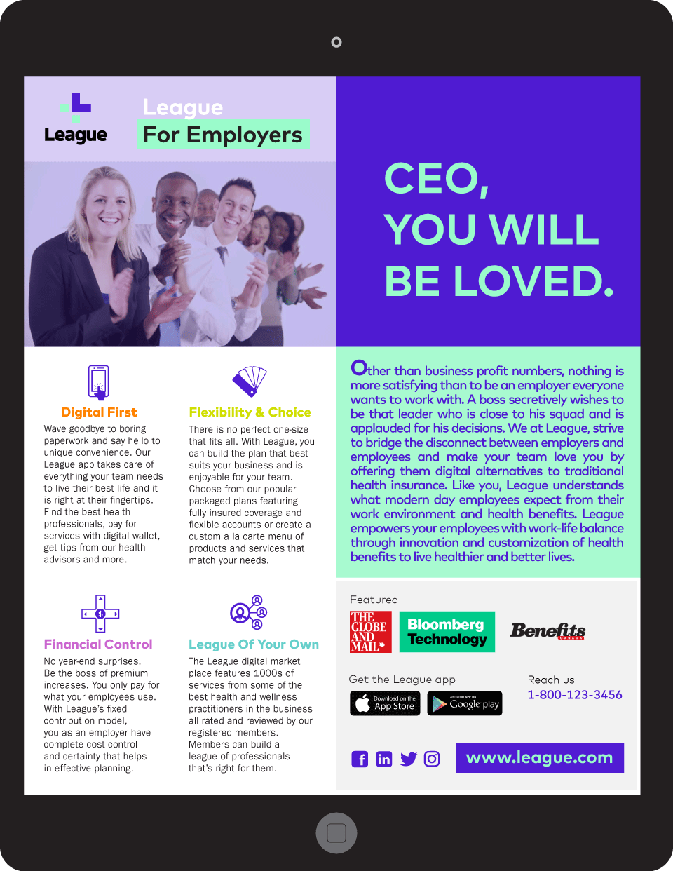 By using my limited knowledge of the League brand, I designed potential sell sheets that League could distribute via emails/events to tell employers of SMBs why League is a better option for their company benefits. My design standpoint was to attract employers by expressing how they could become heroes and leaders for their teams by utilizing the power of League’s products. I wrote headline copy and body copy, crafted icons to support text and added relatable imagery to convey the concept. Since, on of League's marketing goals was trying to promote its digital app, so I used file and tablet layouts for overall look and feel of the content.