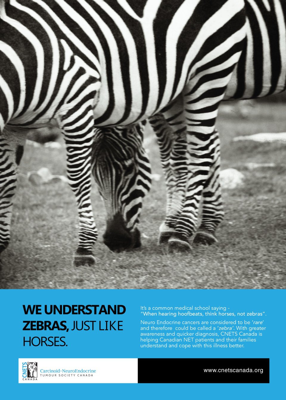 I used this philosophy to draft my second ad with a medical school focus. I envisioned such an ad to be part of their seminar promos and stuck on billboards close to medical departments of colleges so that more and more doctors, medical practitioners and students become aware and associate with CNETS for this cause. Thus, my second proposal ad for CNETS with my thought “We understand zebras just like horses” came into being. It communicated that this group is a set of well learned people who understands the rare illness and wants more interested individuals to join them so that its cure can be as easy as understanding horses (in their terminology). The zebra photograph is one of my captures while visiting the African Lion Safari at Hamilton, ON. :) Visual put to good use.