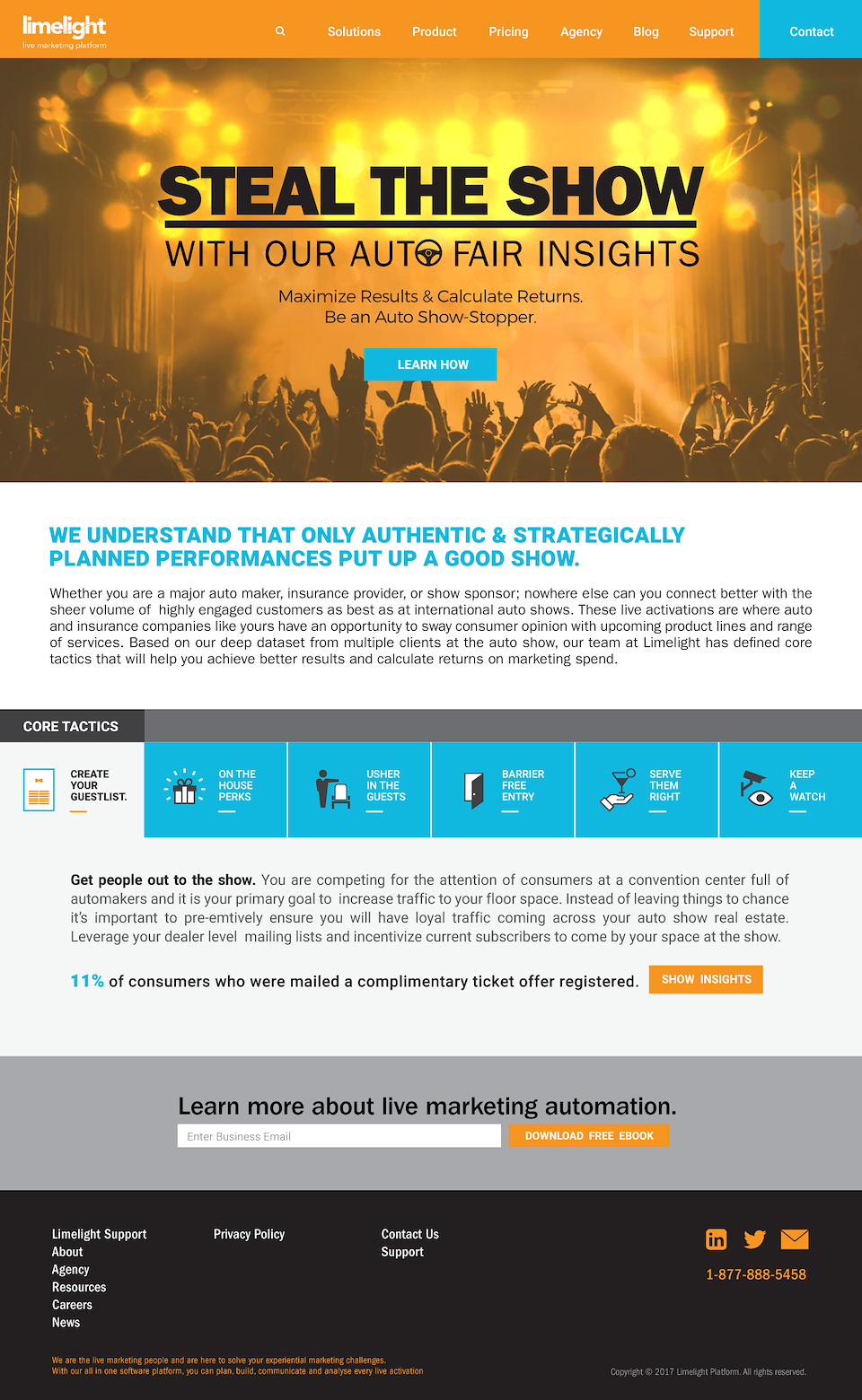 By using my best knowledge of the Limelight brand and carefully understanding the target audience of automakers, auto-insurance providers and auto show sponsors, I have designed a landing page where the concept is that of a concert/show and limelight insights helps you steal the show