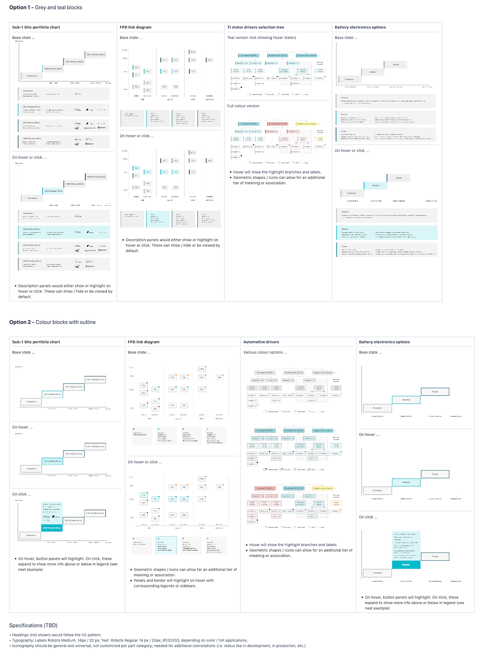 I created interactive graphical visualization for product portals so that users can easily visualize a portfolio and take the next step in selection in their user journey. This improved navigation across expansive portfolio and helped users easily select a device which wasn't earlier possible as the existing visual diagrams/infographics were static, had chaotic information and some didn't even adhere to TI's visual standards.