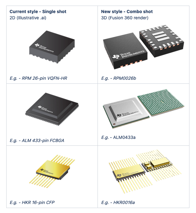 Defined product photography and illustration guidelines streamlining product photography, ensured technical accuracy. I co-managed the project of rendering more than 2000 TI products semiconductor chips which added value by improving technical credibility and visual appeal. It ensured product is showcased in its full potential. Unlike previous illustrations, these 3D illustrations were created using Autodesk Fusion 360 with front and back views, providing the user a better idea of its characteristics and features (no. of pins, material type etc.) thus facilitating better buying decisions.